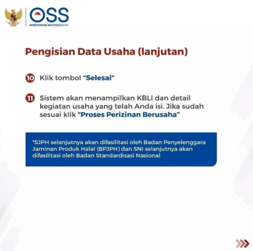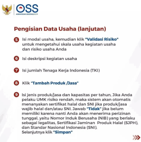 Jika Anda UMK dengan risiko rendah, sistem akan menanyakan sertifikat halal dan SNI. Jika belum memiliki, jawab “Tidak” untuk mendapatkan NIB yang berlaku sebagai legalitas, Sertifikasi Jaminan Produk Halal (SJPH), dan Standar Nasional Indonesia (SNI).
